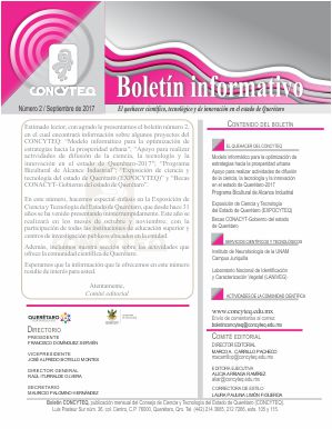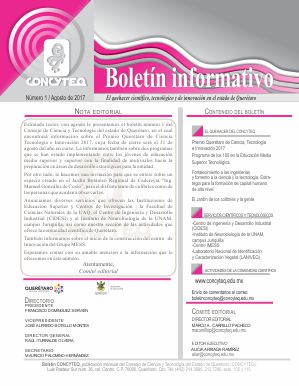 El boletín informativo del CONCYTEQ, se crea con la finalidad de informar sobre el quehacer que se lleva a cabo en el Sistema de Ciencia y Tecnología del Estado de Querétaro y en el propio CONCYTEQ para mantener informados a todos los actores que componen la sociedad queretana. En el número 0, les informamos sobre las últimas actividades que se desarrollaron o que están por llevarse a cabo como la presentación de la convocatoria del Premio Querétaro de ciencia y tecnología e innovación 2017.