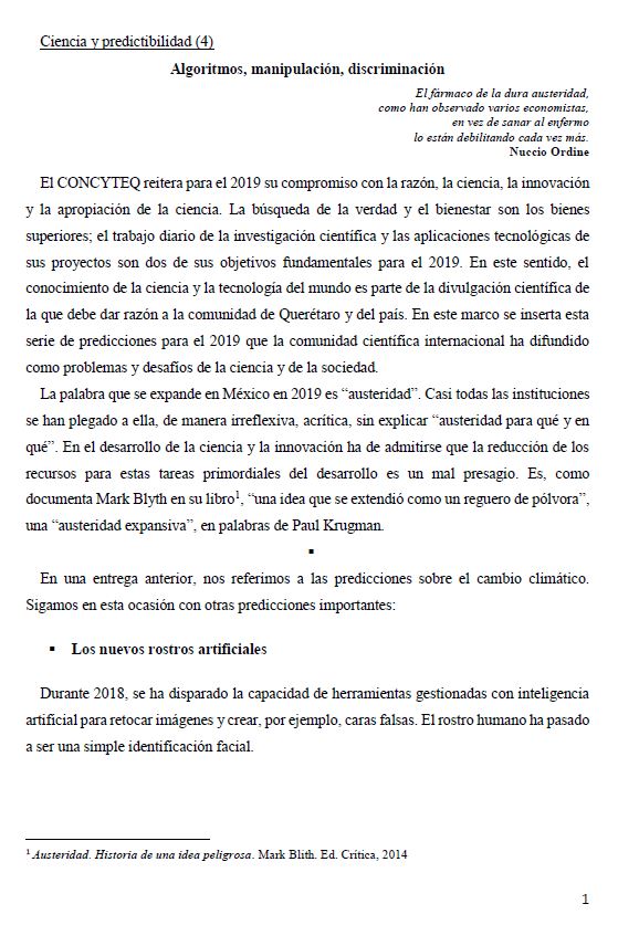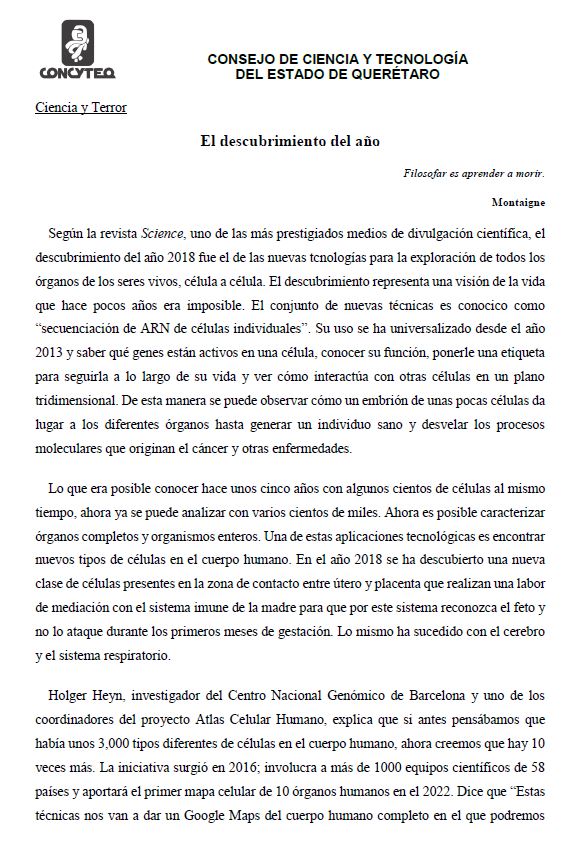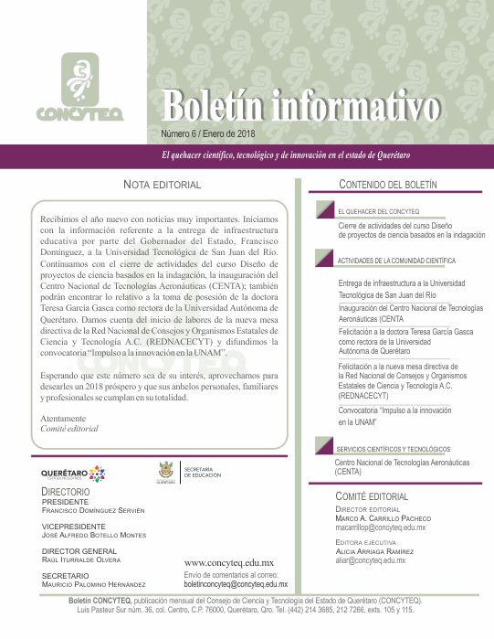 Estimados lectores, iniciamos un nuevo año expresando nuestros mejores deseos y bienestar para cada uno de ustedes y a quienes les rodean. En este número, le informamos que el 24 de enero del presente año, se realizó la clausura del Programa de Estancias, ciclo 2018, en la que 74 estudiantes de las carreras de ingeniería recibieron una constancia por parte del CONCYTEQ. Además, le presentamos las actividades de investigación que desarrolla el Instituto Mexicano del Seguro Social (IMSS), de la Delegación Querétaro. Anunciamos la toma de posesión de la doctora Julia Tagueña Parga, como coordinadora general del foro consultivo científico y tecnológico. Por último, presentamos dos notas: la primera expone algunos datos estadísticos de los científicos más influyentes del mundo, y, la última, llamada “Ética e integridad académica: los otros focos rojos”.