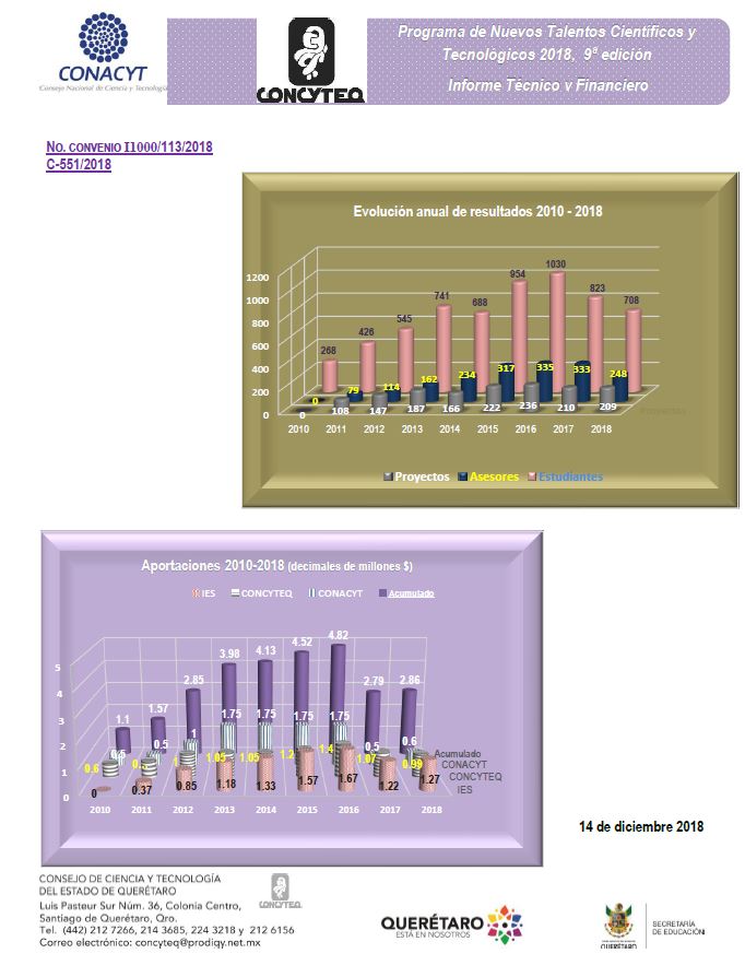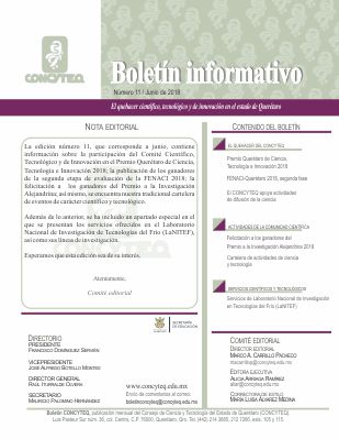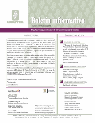 Estimados lectores, en la edición número 19 del boletín informativo les presentamos información sobre algunas de las actividades que desarrolló el CONCyTEQ, como el 1er Concurso de Narrativa de la Naturaleza: “El Jardín Botánico Regional de Cadereyta, un sitio natural para la conservación, 2018” y la clausura de la exposición itinerante “¡Agua, hechos y desechos ¿dónde?!”, exposición que recorrió los 18 municipios del Estado de Querétaro. También presentamos ante ustedes información sobre el foro estatal de consulta “Humanidades, ciencia y tecnología en México: presente y futuro”. Además incluimos varias convocatorias como la del “Premio Alejandrina a la Investigación”, así como convocatorias para participar en diversos talleres, y para colaborar en la edición 2019 de la revista electrónica NTHE. En la sección “Servicios Científicos y Tecnológicos” presentamos los servicios del Instituto de Neurobiología de la UNAM y el tema de infraestructura para el cálculo de aceleraciones máximas del CEGEO-UNAM, Campus Juriquilla .