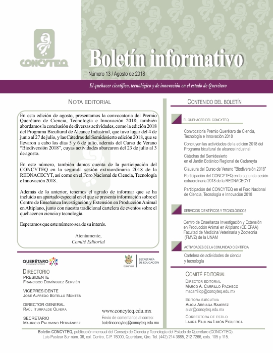 En esta edición de agosto, presentamos la convocatoria del Premio Querétaro de Ciencia, Tecnología e Innovación 2018; también abordamos la conclusión de diversas actividades, como la edición 2018 del Programa Bicultural de Alcance Industrial, que tuvo lugar del 4 de junio al 27 de julio, y las Cátedras del Semidesierto edición 2018, que se llevaron a cabo los días 5 y 6 de julio, además del Curso de Verano “Biodiversión 2018”, cuyas actividades abarcaron del 23 de julio al 3 de agosto. En este número, también damos cuenta de la participación del CONCYTEQ en la segunda sesión extraordinaria 2018 de la REDNACECYT, así como en el Foro Nacional de Ciencia, Tecnología e Innovación 2018 . Además de lo anterior, tenemos el agrado de informar que se ha incluido un apartado especial en el que se presenta información sobre el Centro de Enseñanza Investigación y Extensión en Producción Animal en Altiplano, junto con nuestra tradicional cartelera de eventos sobre el quehacer en ciencia y tecnología. Esperamos que este número sea de su interés.
