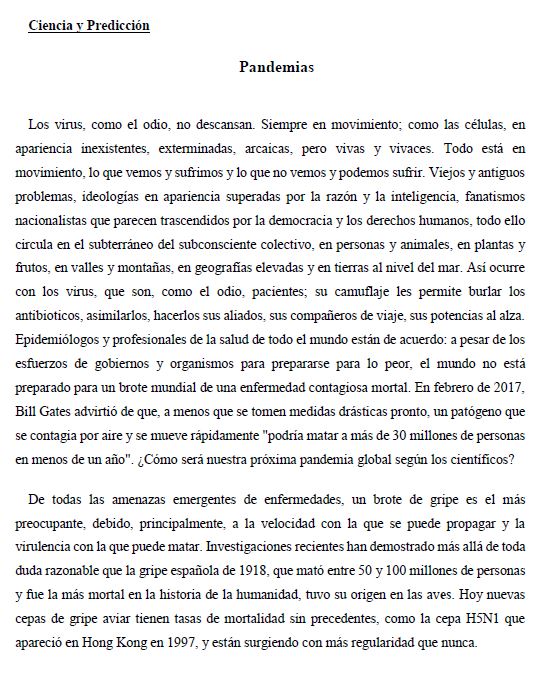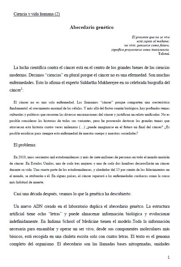 “Abecedario genético” El presente que no se vive está sujeto al mañana; no vivir, pensarse como futuro, significa proyectarse como inexistencia. Tolstoi. La lucha científica contra el cáncer está en el centro de los grandes bienes de las ciencias modernas. Decimos “ciencias” en plural porque el cáncer no es una enfermedad. Son muchas enfermedades. Esto lo afirma el experto Siddartha Mukherejee en su celebrada biografía del cáncer: El cáncer no es una sola enfermedad. Las llamamos “cáncer” porque comparten una característica fundamental: el crecimiento anormal de las células. Y más allá del factor común biológico, hay profundos temas culturales y políticos que recorren las diversas encarnaciones del cáncer y justifican un relato unificado. No es posible considerar las historias de todas sus variantes, pero he procurado destacar los grandes temas que atraviesan esta historia cuatro veces milenaria (…) ¿puede imaginarse en el futuro un final del cáncer? ¿Es posible erradicar para siempre esta enfermedad de nuestro cuerpo y nuestras sociedades?