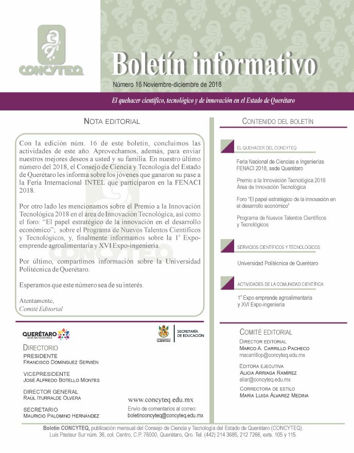 Con la edición núm. 16 de este boletín, concluimos las actividades de este año. Aprovechamos, además, para enviar nuestros mejores deseos a usted y su familia. En nuestro último número del 2018, el Consejo de Ciencia y Tecnología del Estado de Querétaro les informa sobre los jóvenes que ganaron su pase a la Feria Internacional INTEL que participaron en la FENACI 2018. Por otro lado les mencionamos sobre el Premio a la Innovación Tecnológica 2018 en el área de Innovación Tecnológica, así como el foro: “El papel estratégico de la innovación en el desarrollo económico”; sobre el Programa de Nuevos Talentos Científicos y Tecnológicos, y, finalmente informamos sobre la 1a Expo-emprende agroalimentaria y XVI Expo-ingeniería. Por último, compartimos información sobre la Universidad Politécnica de Querétaro. Esperamos que este número sea de su interés.