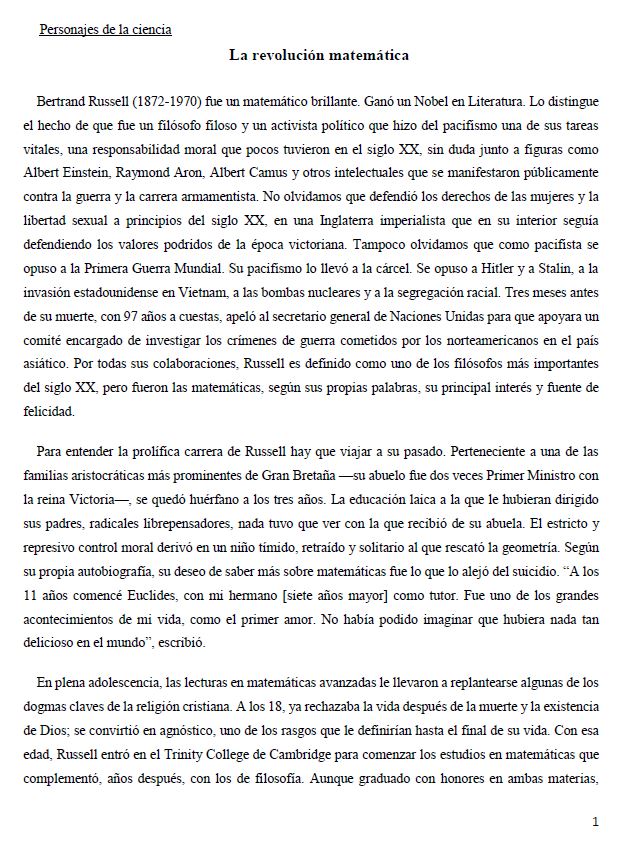 “La revolución matemática” Bertrand Russell (1872-1970) fue un matemático brillante. Ganó un Nobel en Literatura. Lo distingue el hecho de que fue un filósofo filoso y un activista político que hizo del pacifismo una de sus tareas vitales, una responsabilidad moral que pocos tuvieron en el siglo XX, sin duda junto a figuras como Albert Einstein, Raymond Aron, Albert Camus y otros intelectuales que se manifestaron públicamente contra la guerra y la carrera armamentista.