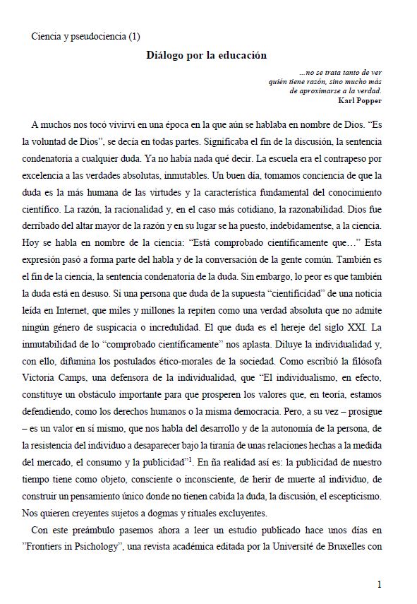 “Diálogo por la educación” …no se trata tanto de ver quién tiene razón, sino mucho más de aproximarse a la verdad. Karl Popper A muchos nos tocó vivirvi en una época en la que aún se hablaba en nombre de Dios. “Es la voluntad de Dios”, se decía en todas partes. Significaba el fin de la discusión, la sentencia condenatoria a cualquier duda. Ya no había nada qué decir. La escuela era el contrapeso por excelencia a las verdades absolutas, inmutables. Un buen día, tomamos conciencia de que la duda es la más humana de las virtudes y la característica fundamental del conocimiento científico. La razón, la racionalidad y, en el caso más cotidiano, la razonabilidad. Dios fue derribado del altar mayor de la razón y en su lugar se ha puesto, indebidamente, a la ciencia.
