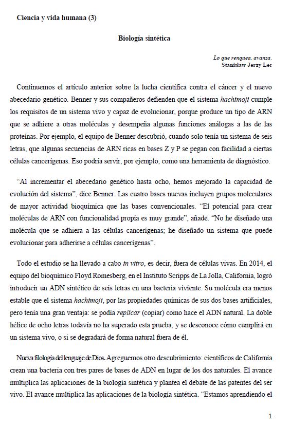 “Biología sintética” Lo que renquea, avanza. Stanis?aw Jerzy Lec Continuemos el artículo anterior sobre la lucha científica contra el cáncer y el nuevo abecedario genético. Benner y sus compan?eros defienden que el sistema hachimoji cumple los requisitos de un sistema vivo y capaz de evolucionar, porque produce un tipo de ARN que se adhiere a otras mole?culas y desempen?a algunas funciones ana?logas a las de las protei?nas. Por ejemplo, el equipo de Benner descubrio?, cuando solo teni?a un sistema de seis letras, que algunas secuencias de ARN ricas en bases Z y P se pegan con facilidad a ciertas ce?lulas canceri?genas. Eso podri?a servir, por ejemplo, como una herramienta de diagno?stico.