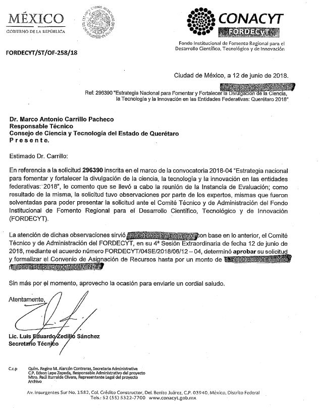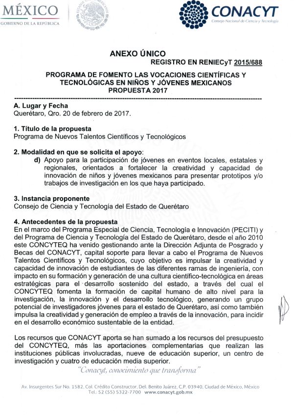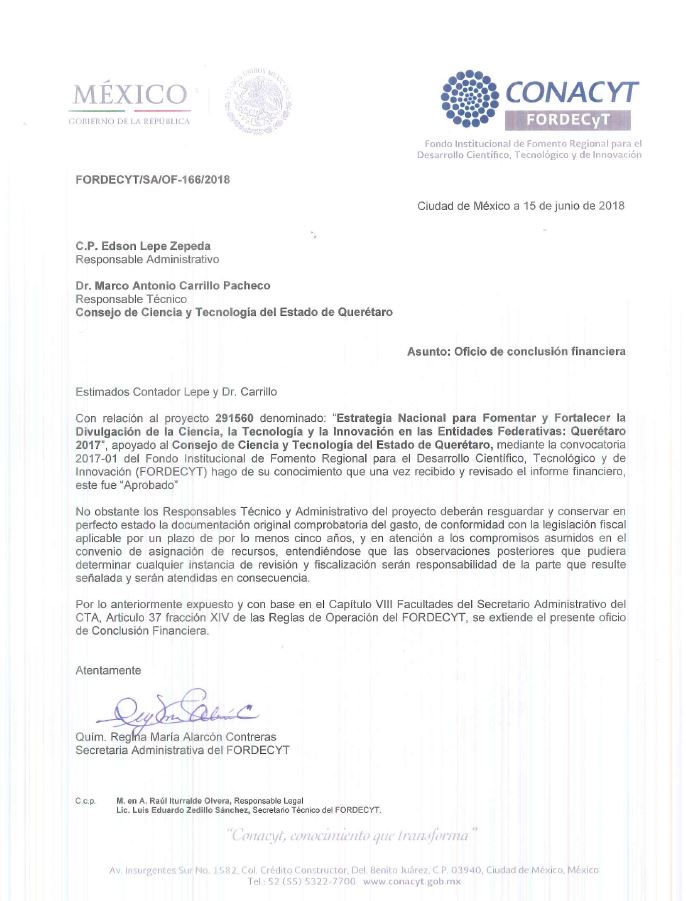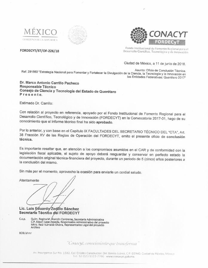 El impulso a la Ciencia, la Tecnología y a la Innovación (CTI), es la base fundamental para generar un desarrollo sostenible a largo plazo. Actualmente no se puede pensar en un país que no genere acciones estratégicas para fortalecer e impulsar un ecosistema científico, tecnológico y de innovación. En el estado de Querétaro somos conscientes de este gran reto nacional y estatal. El Consejo de Ciencia y Tecnología del Estado de Querétaro (CONCYTEQ), participa en su calidad de organismo público responsable de coordinar los esfuerzos que en materia de CTI se realicen en la entidad.